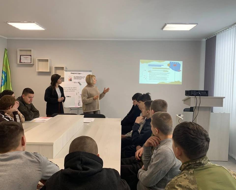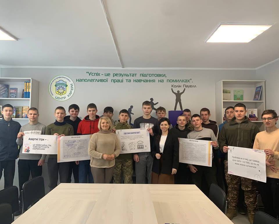 Під час зустрічі здобувачі освіти з’ясували, що таке азартна гра, у чому її небезпека та як формується залежність. Окрему увагу приділили явищу лудоманії та її негативному впливу на фізичний, психологічний і соціальний стан людини. Студенти обговорили способи протидії ризикам, визначили власні ресурси для збереження відповідальної поведінки та дізналися, куди звертатися по допомогу. У роботі використано електронну брошуру «Азартні ігри – це лише розвага». Захід відбувся в інтерактивному форматі: учасники виконали вправи «Міф і реальність», «Ланцюжок наслідків» та розгадали тематичний філворд. Адже профілактика починається зі знань і свідомого вибору.