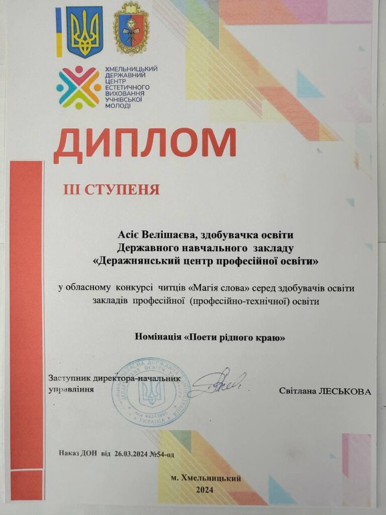 У номінації «Есе» І місце посіла талановита студентка 24 групи, Шиліна Марина. Керівниця: Сніжана Бриндзак.